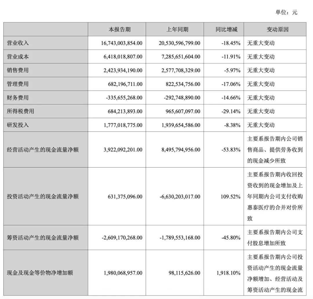 半年报数据显示,截至2025年6月末,迈瑞医疗经营活动现金流净额仅39.22亿元,同比大幅下滑54%,公司坦言,这一变化与销售商品、提供劳务收到的现金减少直接相关,同期公司营业收入167亿元、同比下降约18%,归母净利润50.7亿元、同比下降33%。海外市场虽贡献50%营收,但发展中国家业务增速放缓至5.39%。